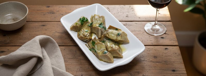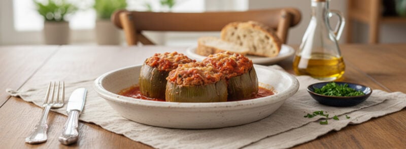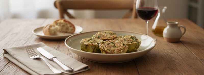 I carciofi vengono sigillati con un ripieno semplice e poi vengono immersi nel sugo, dove cuociono piano e si insaporiscono fino al cuore. È un piatto che sembra fatto apposta per la domenica, ma in realtà è perfetto anche quando vuoi una cena gustosa e profumata.