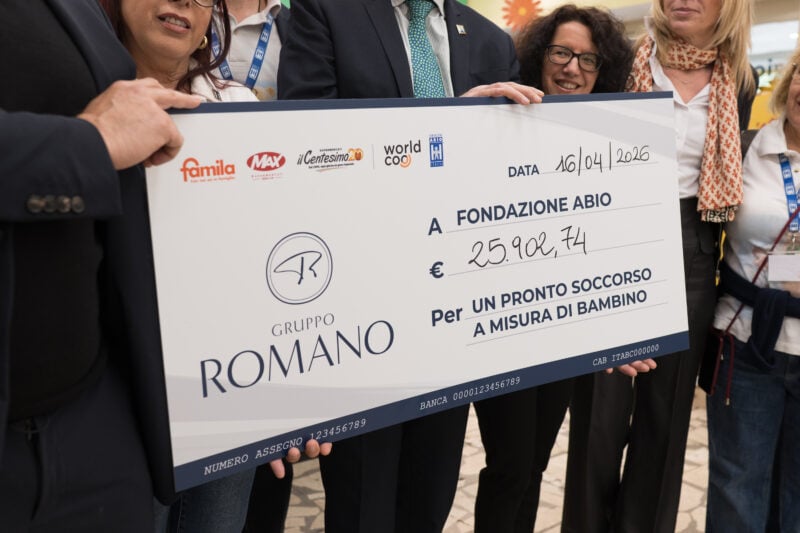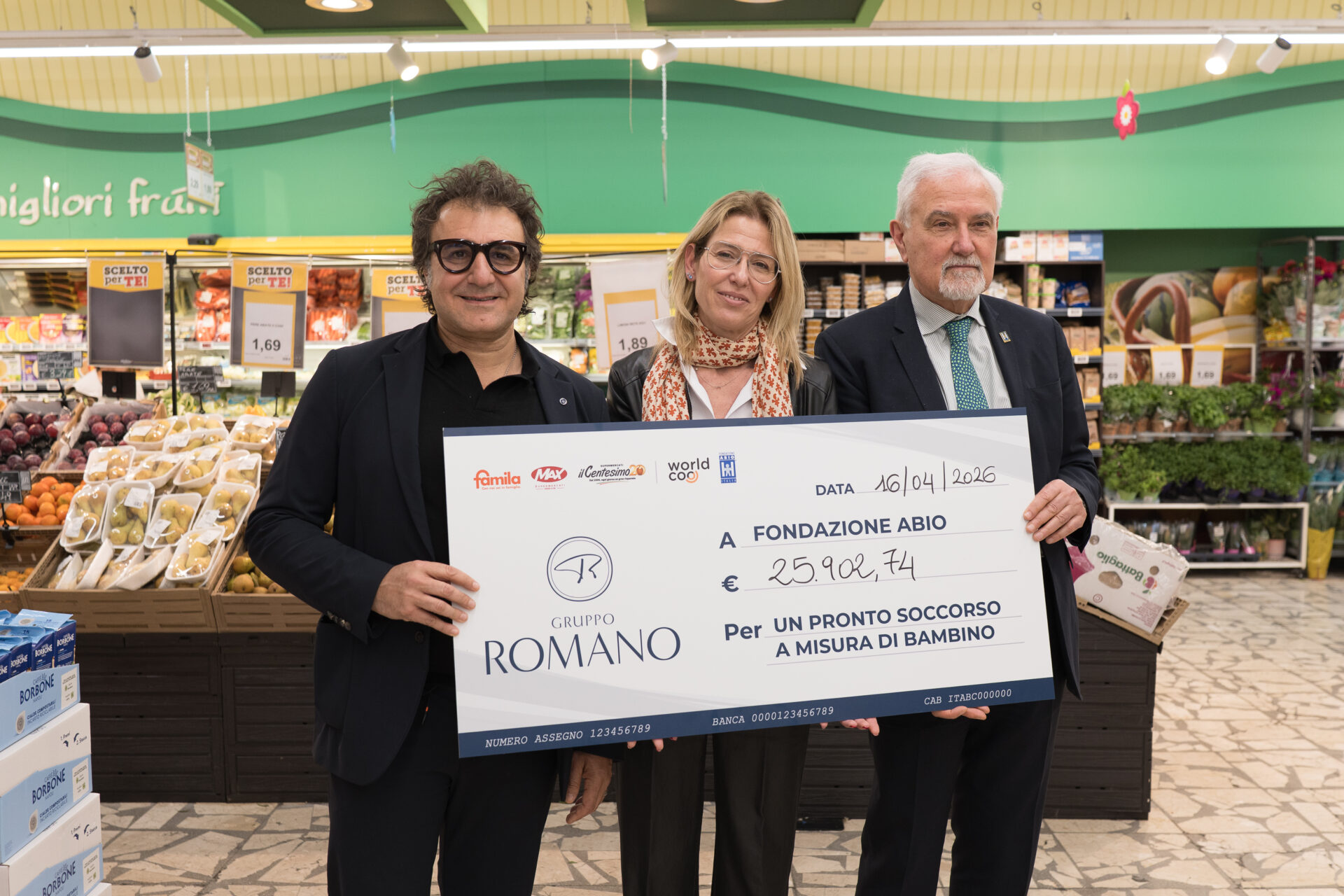 La consegna dell’assegno si è svolta nel punto vendita Il Centesimo di San Cataldo, alla presenza di Rossella Antelmi (Worldcoo), Angelo Agliata, Amministratore Delegato del Gruppo Romano, dei volontari ABIO, del Vicepresidente e di alcuni consiglieri dell’associazione, insieme al Direttore del punto vendita.